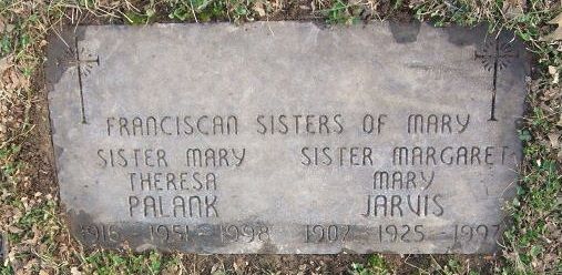 | JARVIS | Margaret Mary | Sister Catherine Mary Franciscan Sisters of Mary | ![]() | 1907 ~ 1997 | Section 20E, Lot SSM Resurrection Cemetery 6901 Mackenzie Road St. Louis, MO | Daughter of William Henry JARVIS, Jr & Mary Rose DEEHAN |