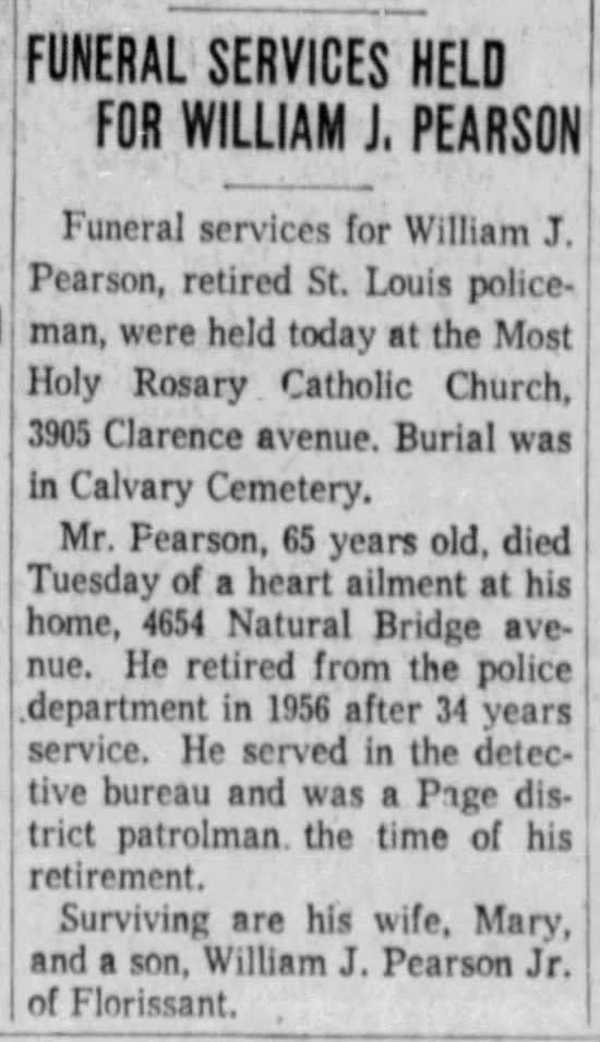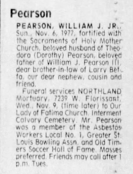 | PEARSON, William J. Jr b 12 Nov 1916 ~ d 6 Nov 1977 Son of William “Bill” James PEARSON, Sr & Mary FOLEY Married to Theodora “Dorothy” A. BEFFA | ![]() |
