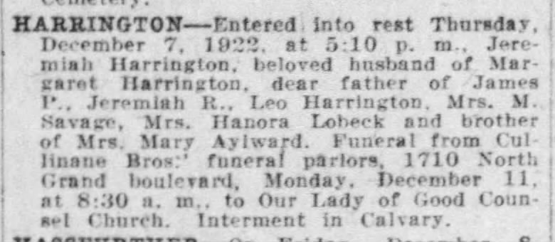 | Harrington, Jeremiah b abt 1855 ~ d 7 Dec 1922 Married to Margaret “Maggie” CANTY | ![]() |