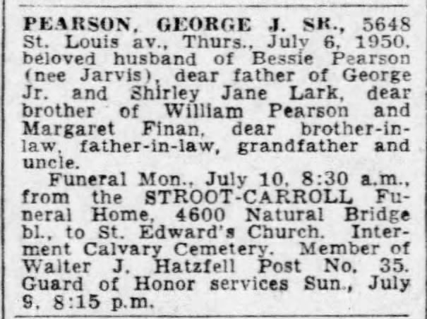 | Pearson, George J Jr. b 2 Sep 1923 ~ 18 Jul 1981 Married to Florence “Bow” Elizabeth LIEB | ![]() |