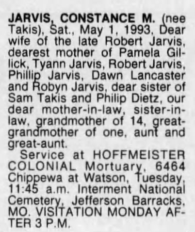 | JARVIS, Constance M. TAKIS, Constance M., married Name: JARVIS b 8 Jan 1925 ~ d 1 May 1993 Married to Robert “Bobby” Eugene JARVIS | ![]() |