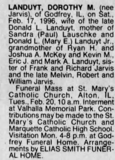 | LANDUYT, Dorothy M. JARVIS, Dorothy Mae married name: LANDUYT b abt 29 May 1928 ~ d 17 Feb 1996 Daughter of Franklin Arthur JARVIS & Iris Madeline ROLLER | ![]() |