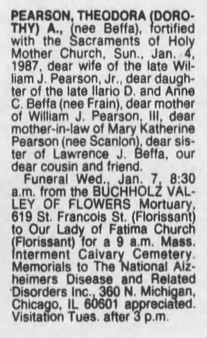 | PEARSON, Theodora “Dorothy” BEFFA, Theodora married name PEARSON b 31 Aug 1913 ~ 4 Jan 1987 Married to William James PEARSON, Jr | ![]() |